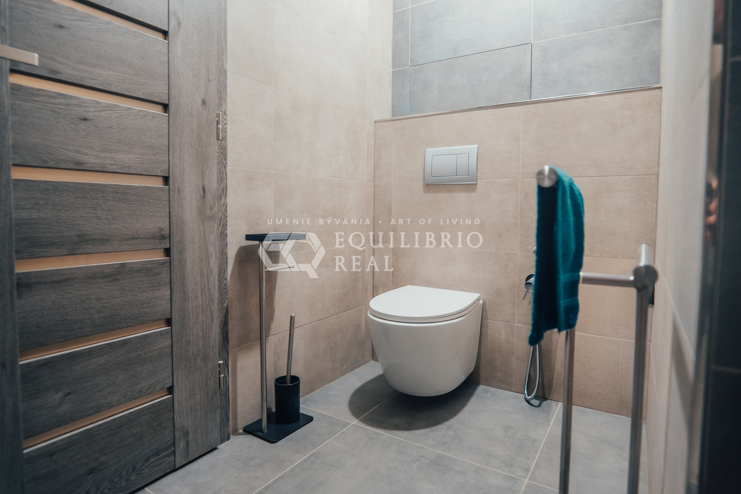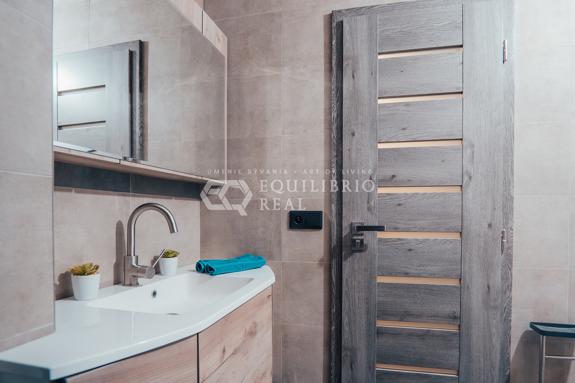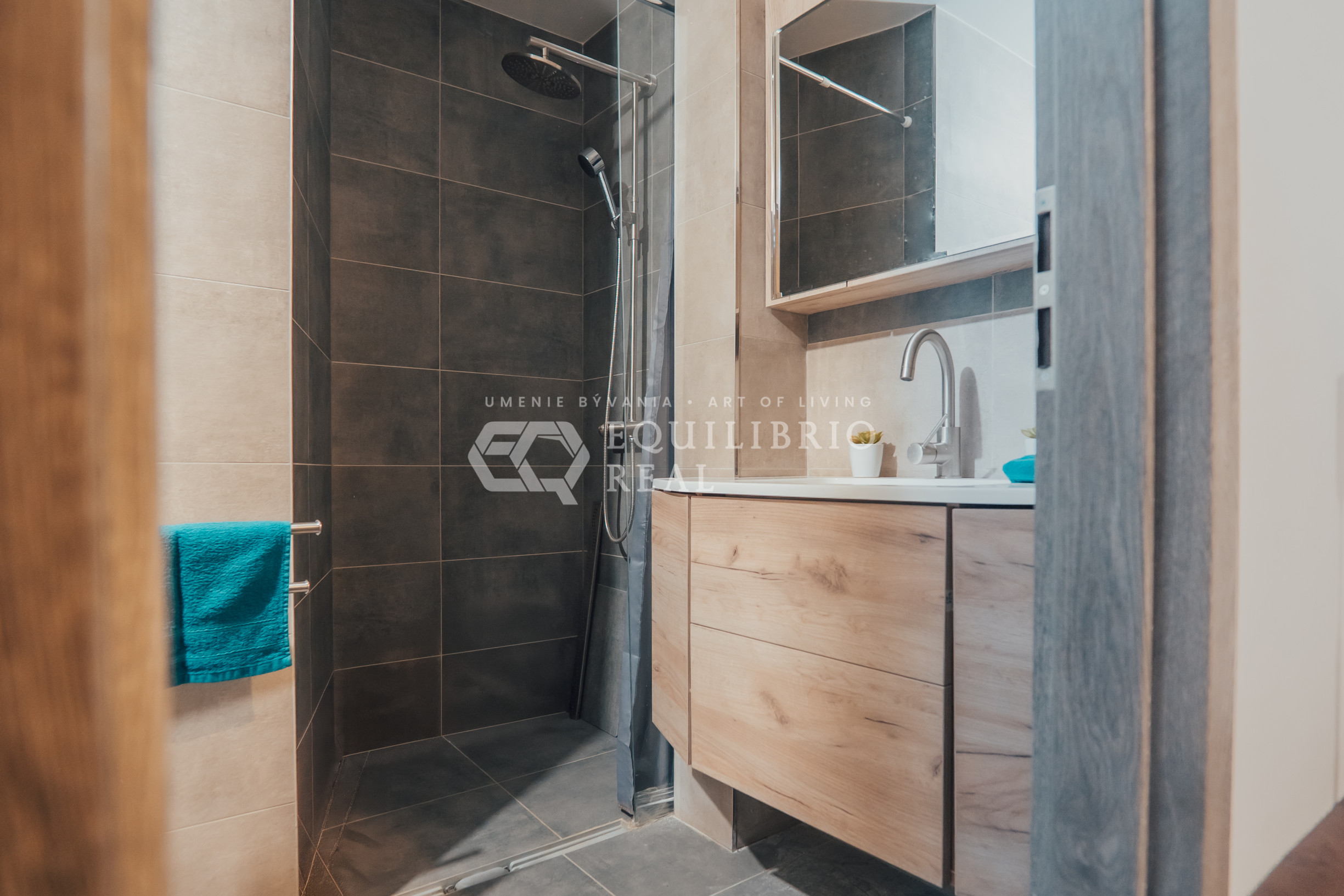Kompletná rekonštrukcia bola realizovaná s dôrazom na kvalitu použitých materiálov, nadčasovosť a funkčnosť priestoru. Samozrejmosťou je klimatizácia pre maximálne pohodlie počas horúcich dní a elektrické podlahové kúrenie, ktoré zabezpečuje príjemnú teplotu počas celého roka. Zapustené posuvné dvere šetria priestor a zároveň dodávajú interiéru čistý, moderný vzhľad.