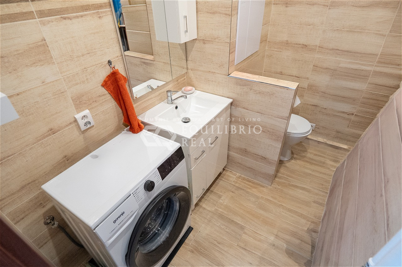 Byt pozostáva z obývacej izby, kuchyne, chodby a kúpeľne so spoločnou toaletou. Pred tromi rokmi prešiel kompletnou rekonštrukciou, ktorá priniesla moderný štýl a praktickosť. Kuchyňa je vybavená elektrickou rúrou, plynovou varnou doskou a umývačkou riadu, čo uľahčuje varenie a poskytuje komfort. Kúpeľňa je priestranná a elegantná, so sprchovacím kútom a umývadlom so skrinkou. Praktická vstavaná skriňa na chodbe poskytuje dostatok úložného priestoru a zároveň udržiava interiér čistý a uprataný. Byt je vybavený kvalitnými bezpečnostnými dverami, ktoré spájajú eleganciu a spoľahlivú ochranu.